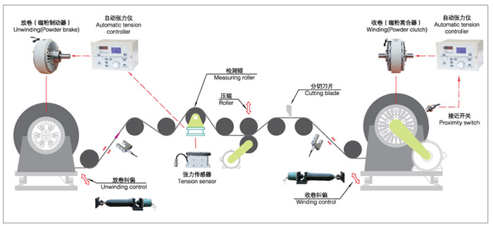 由于磁粉離合器/制動(dòng)器具有以上特性,現(xiàn)已廣泛就用于造紙、印刷、塑料、橡膠、紡織、印染、電線電纜、冶金以及其他相關(guān)卷取加工行業(yè)中收卷和放卷張力的控制。下面是一套較為完整的張力控制系統(tǒng)示意圖。
