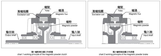激磁線圈有電流通過時(shí),磁軛中產(chǎn)生工作磁通,工作腔中的磁粉沿磁通方向呈鏈狀連接起來(形成磁粉鏈),磁粉離合器就是靠此時(shí)磁粉與磁粉、與工作面之間的摩擦力和磁粉鏈之間的抗剪力來傳遞轉(zhuǎn)矩,磁粉離合器處于結(jié)合狀態(tài)。(見圖1)