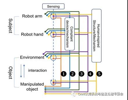 在高精度的抓取和裝配工作中,僅僅依靠機械手本身的精度不能滿足任務要求。近期在IEEE TRANSACTIONS ON MECHATRONICS 上發(fā)表的一篇名為《A Survey of Methods and Strategies for High-Precision RoboticGrasping and Assembly Tasks—Some New Trends》的文章對近年來在機器人高精度抓取和裝配方面的研究工作進行了分類、回顧和比較,并闡述了該領域的研究趨勢。 文章介紹了高精度機器人操控的五類方法:(1)基于傳感信息的方法(2)基于柔順機構的方法(3)基于環(huán)境約束的方法(4)基于感知約束集成的方法(5)仿生的方法。如圖1所示,示意圖展示了五類方法之間的差異。在機器人操控中,主體是機器人的手臂和手,客體是環(huán)境和被操控的對象。虛線表示傳感信息,回路表示傳感器感知到的最新狀態(tài)。