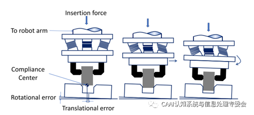 (1)遠端柔性中心(RCC) RCC是由Whitney和Nevins發(fā)明的,用于幫助機器人完成插入和裝配任務[41]。在他們的研究中,他們廣泛地討論了機器人的插入過程[42]。在插入過程中,銷釘會在軸向旋轉夾持器下傾斜,這稱為柔性中心。如圖3所示,RCC裝置實際上是一個有6個自由度的彈性機構,可以改變系統(tǒng)柔度中心的位置。在[43]中開發(fā)了一種具有計算機可調阻抗的主動柔性末端執(zhí)行器。目前,將RCC與其他設備或控制方法相結合是非常有研究價值的課題。